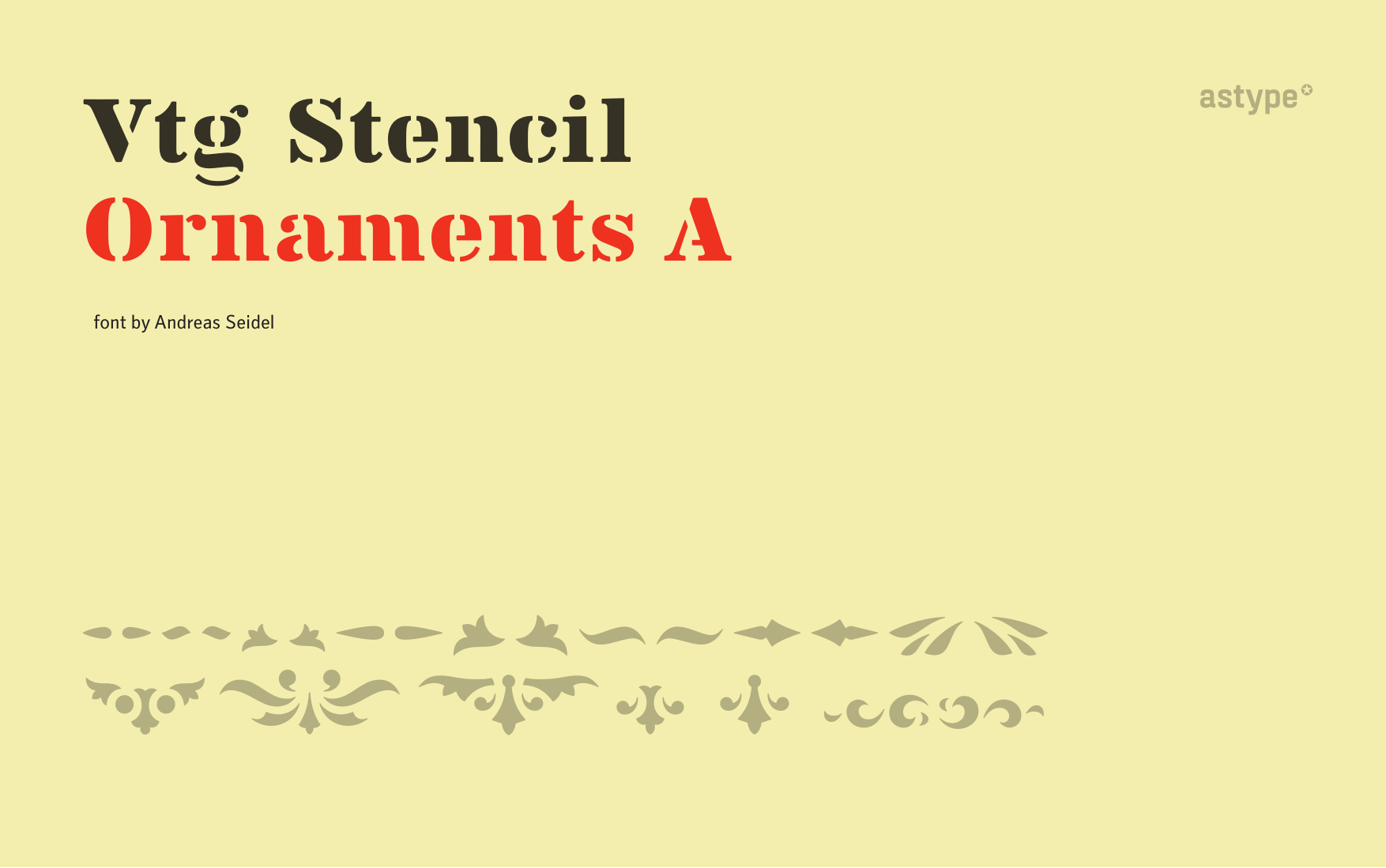 >>> The Vtg Stencil Ornaments A font was created to complement the American Vintage Stencil (Vtg Stencil) fonts. To find matching companion fonts, we recommend exploring Vtg Stencil US No.1, No.51, and No.72.